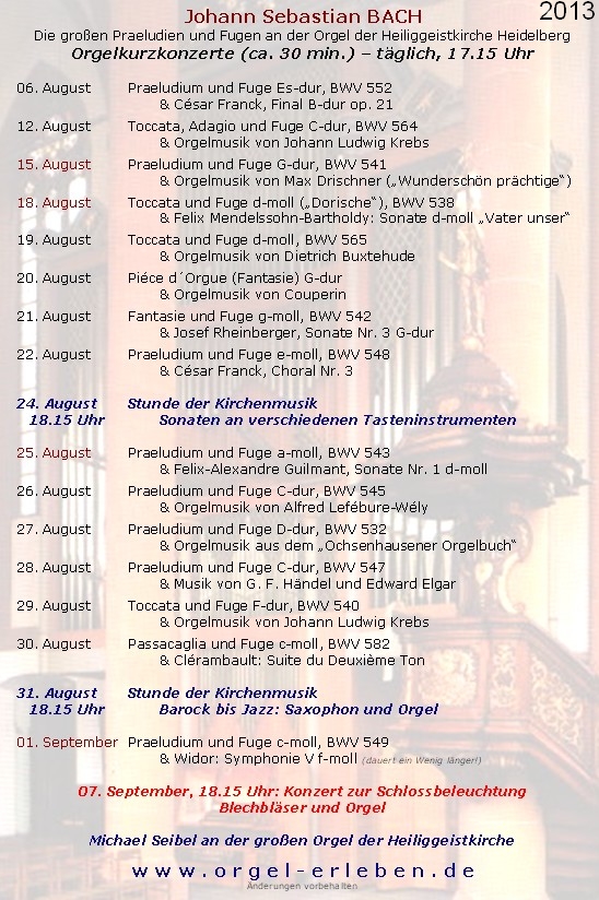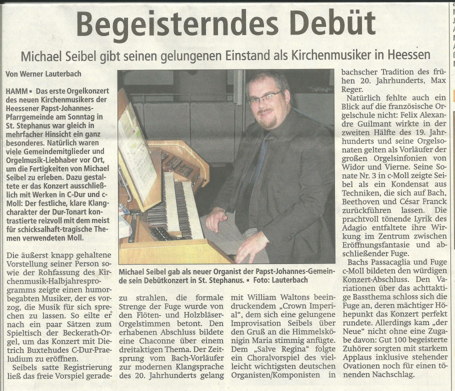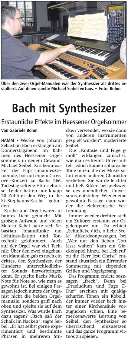 "Organist Seibel zeigt, was die Overmann-Orgel aus dem Jahr 1821 alles kann, wenn Organist und Komponist ihr Werk verstehen: Schalmeien und Donnergrollen, Kirmesmusik und Kirchenmusik, Renaissance und Polka, Meditation und wohlproportionierter Krach. Keine selbstverliebte Technikschau, spielerisch hoch anspruchsvoll und für den Zuhörer ein Erlebnis."