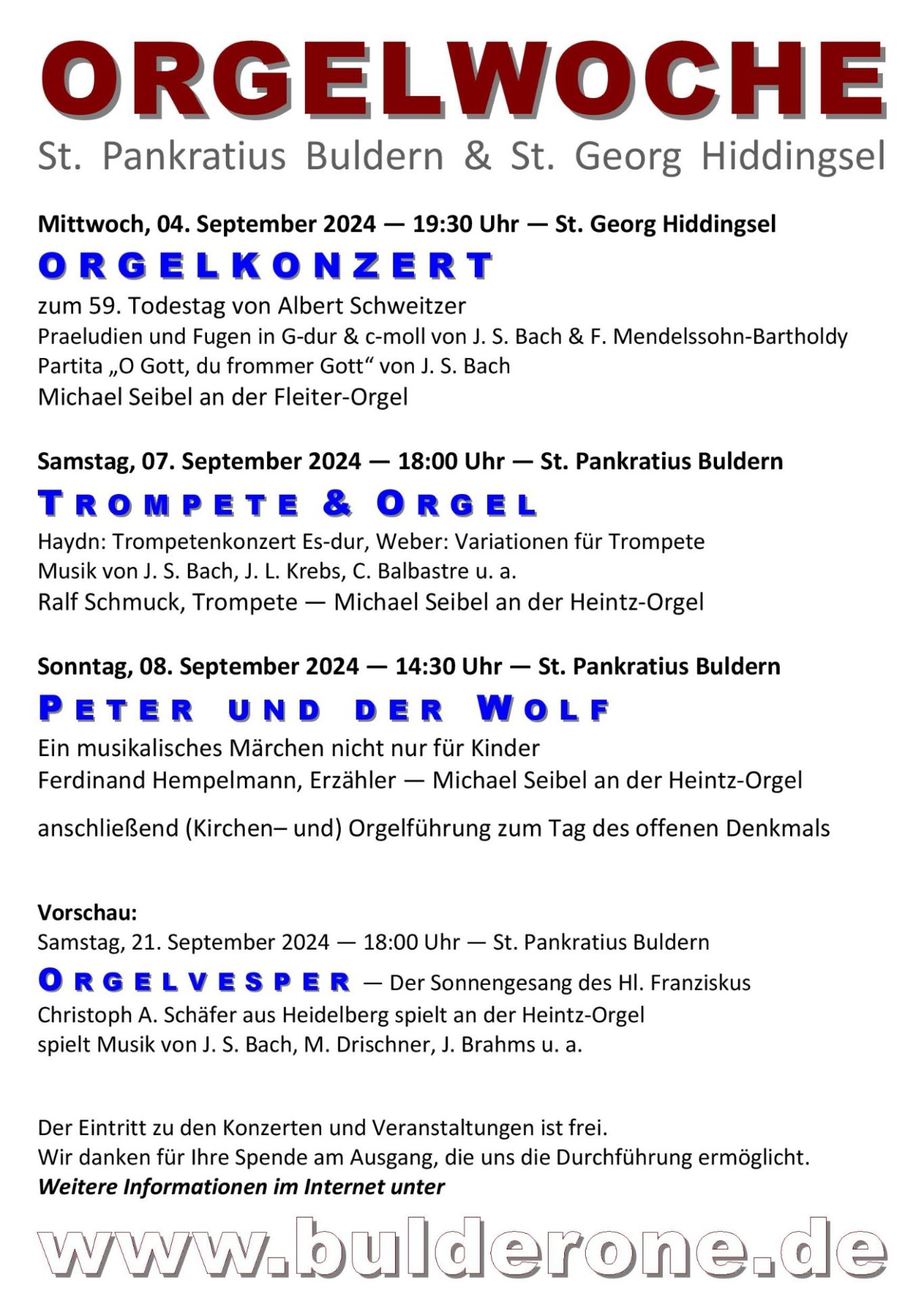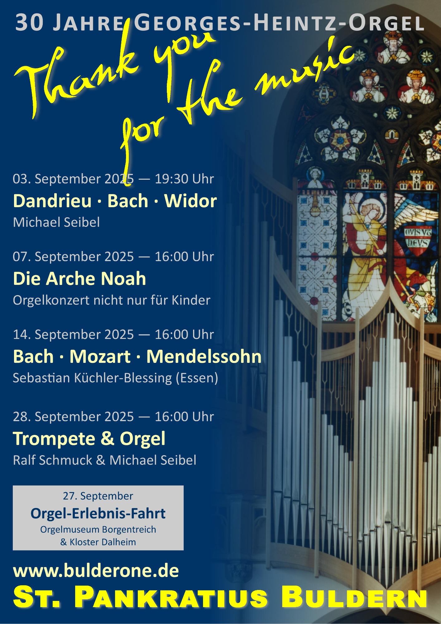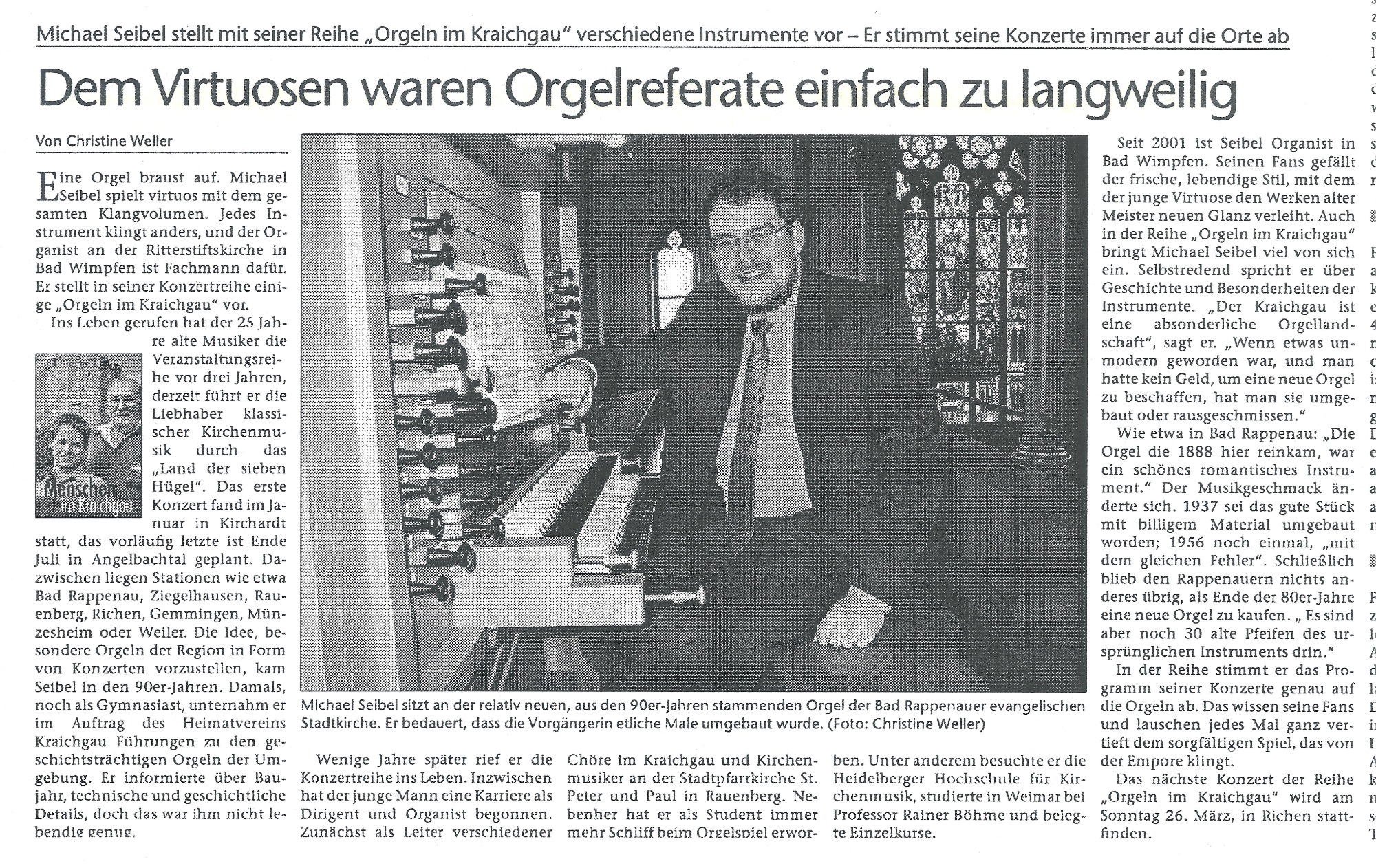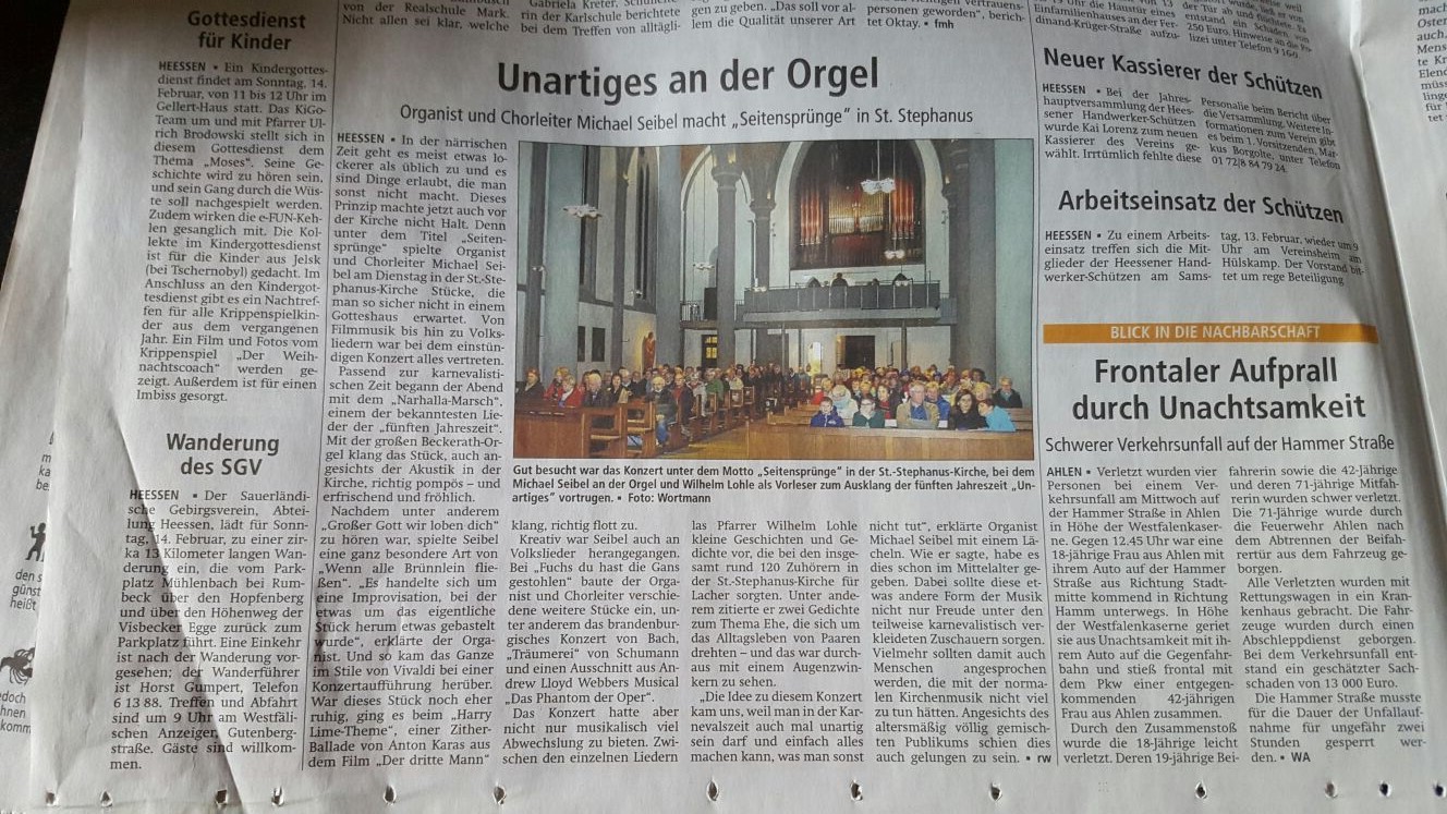 "Organist Seibel zeigt, was die Overmann-Orgel aus dem Jahr 1821 alles kann, wenn Organist und Komponist ihr Werk verstehen: Schalmeien und Donnergrollen, Kirmesmusik und Kirchenmusik, Renaissance und Polka, Meditation und wohlproportionierter Krach. Keine selbstverliebte Technikschau, spielerisch hoch anspruchsvoll und für den Zuhörer ein Erlebnis."